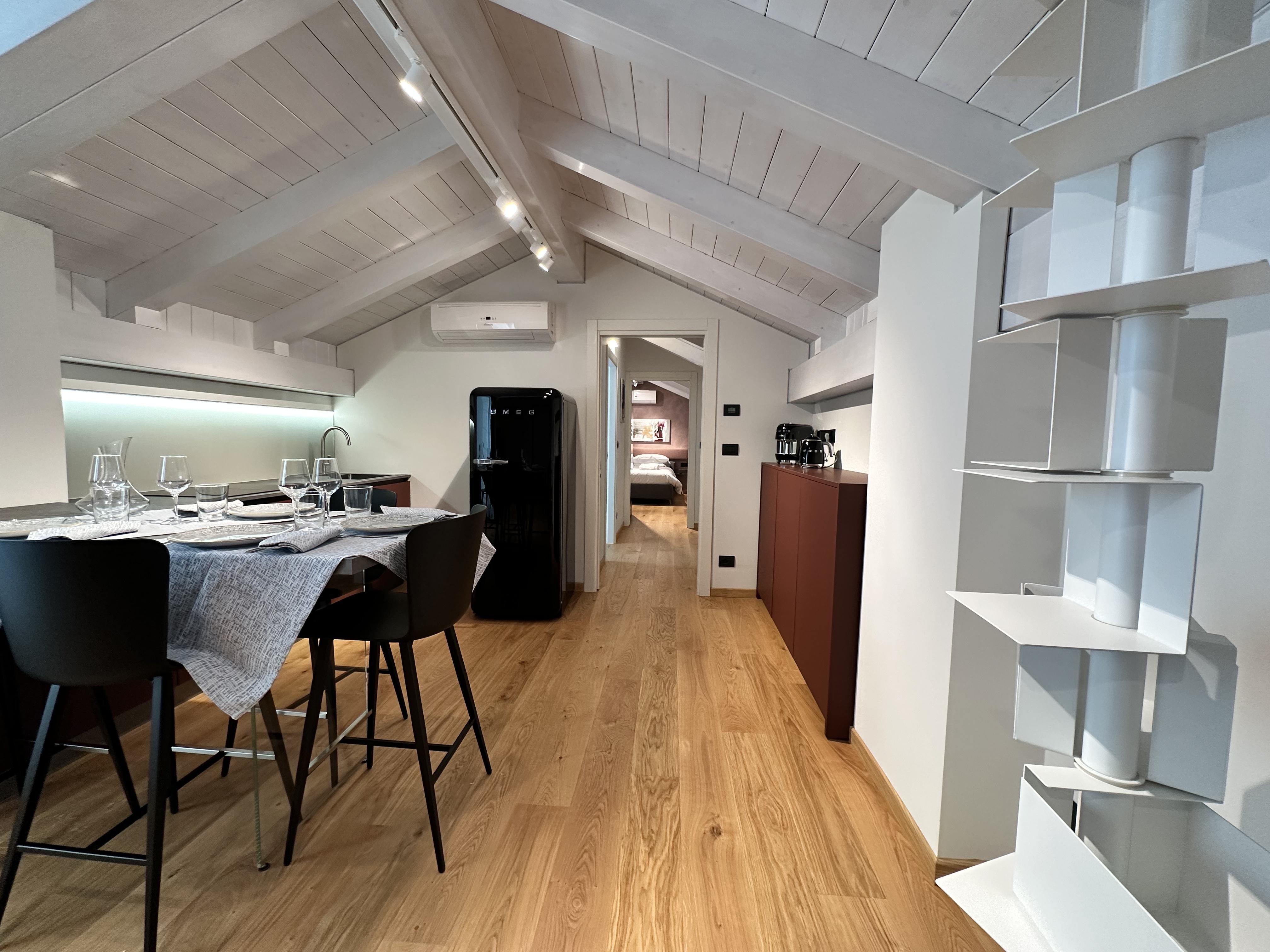 Apartamento abuhardillado de dos habitaciones de unos 60 metros cuadrados, equipado con dormitorio doble, baño y salón con cocina americana. Para un máximo de cuatro Huéspedes.