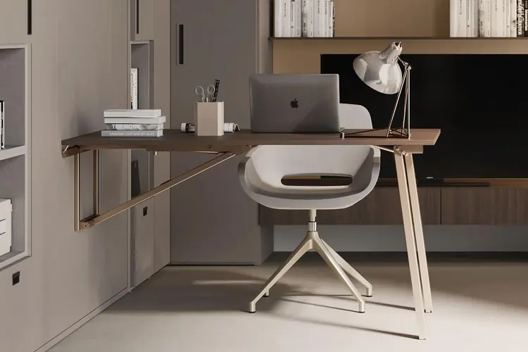 Slim is a folding wall-mounted folding table, the ideal space-saving solution for furnishing a studio apartment, living room, open space or any other living or contract context with a multifunctional character. Extremely thin, when closed it looks like a shallow and very discreet wall panel, capable of blending in both on the wall and with the rest of the furnishings. When open, it transforms into a true retractable table measuring about 140x80 cm. Customizable in wood effect or Sample colors, the top is supported by modern metal trestle legs that-when the table is closed to the wall-remain hidden inside the structure.